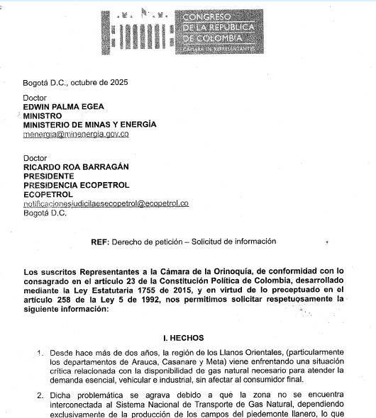 El Representante a la Cámara Hugo Archila radicó un derecho de petición ante el Ministerio de Minas y Energía y la Presidencia de Ecopetrol, solicitando acciones urgentes frente al desabastecimiento de gas natural vehicular que afectaría a los departamentos de Casanare, Arauca y Meta a partir del primero de diciembre.