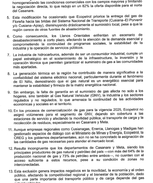 En el documento, el parlamentario solicitó información específica sobre las cantidades de gas asignadas a la región, los volúmenes destinados a gas natural vehicular y los mecanismos de priorización en las ventas de gas. También pidió que se garantice el abastecimiento local ante el posible desabastecimiento que se avecina.