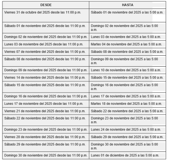 Esta medida entrará en vigencia a partir de la noche del 31 de octubre de 2025 y se extenderá durante todos los fines de semana del mes de noviembre, incluyendo aquellos periodos que contengan un lunes festivo.