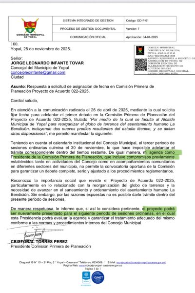 El trámite legislativo del Proyecto de Acuerdo 022-2025, que busca reorganizar los terrenos del asentamiento humano La Bendición en Yopal, no se realizará este año. La solicitud del concejal Jorge Leonardo Infante Tovar para fijar una fecha de debate fue respondida de manera formal por el presidente de la Comisión Primera de Planeación, Cristóbal Torres Pérez argumentando que por su apretada agenda no le quedó tiempo este año.