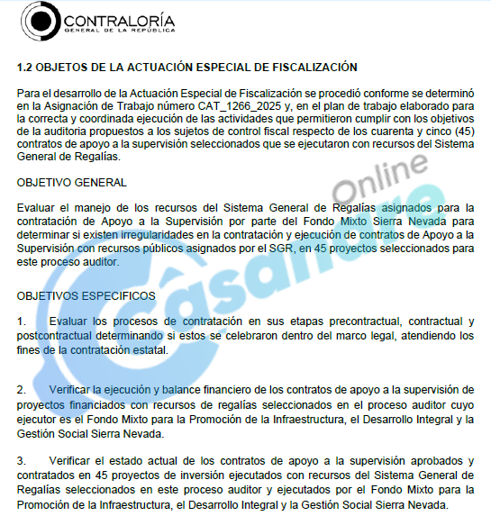 El sistema opaco del FMSN fue examinado rigurosamente por la Contraloría General de la República (CGR) mediante la Actuación Especial de Fiscalización (AEF) CAT_1266_2025, cuyo enfoque estuvo en 45 contratos de “Apoyo a la Supervisión” para proyectos en Arauca, Casanare, Meta, Vaupés y Vichada. El valor total de estos contratos de apoyo, incluyendo adiciones, alcanzó la cifra de $2.013.816.972.570