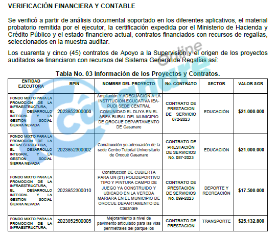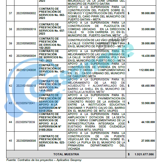En el departamento de Casanare, la Contraloría identificó 28 de estos contratos, abarcando proyectos tan disímiles como la construcción de redes de gas natural en Villanueva (Contrato No. 039-2023), el mejoramiento de vías terciarias en Támara (Contrato No. 079-2023) y la implementación de sistemas productivos de piña y plátano en Tauramena (Contratos No. 146-2023 y No. 145-2023).