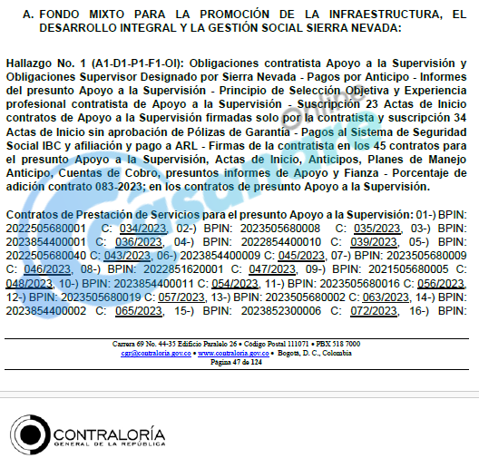 - Pagos sin respaldo: A la contratista se le aprobaron anticipos por $1.006.908.486, lo que la configuró como presunta gestora fiscal. En 23 de los 45 contratos, el anticipo se pagó sin que el supervisor designado por el FMSN (el Representante Legal del Fondo) firmara las Actas de Inicio, incumpliendo un requisito contractual esencial para el desembolso.