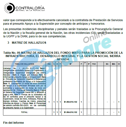 Como resultado de las irregularidades, se configuró un hallazgo administrativo con presunta incidencia disciplinaria, penal y fiscal. La cuantía del presunto detrimento patrimonial se calculó en $1.804.816.152, valor que corresponde a los honorarios y anticipos pagados a la contratista por este supuesto apoyo.