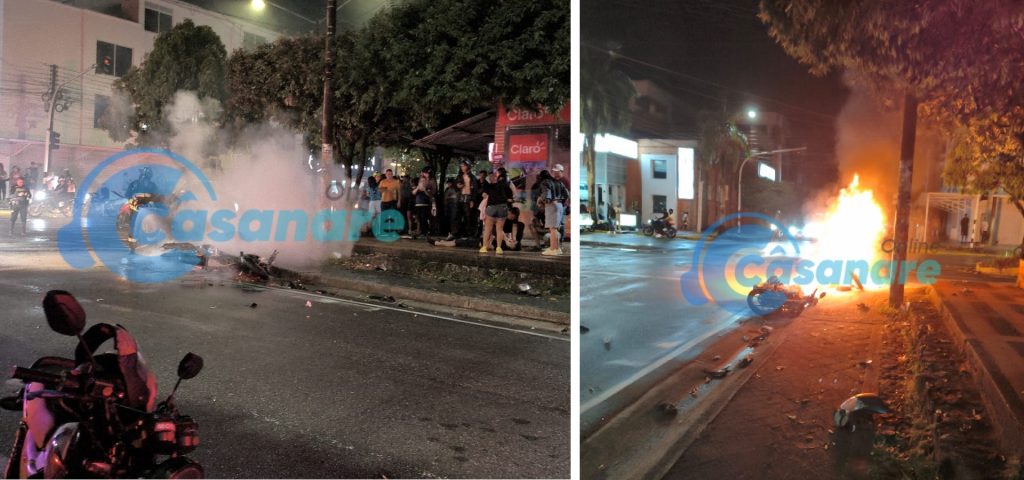 Dos motocicletas se incendiaron luego de una violenta colisión registrada en el cruce de la carrera 21 con calle 24 en Yopal Casanare. Dos personas, identificadas como Zamira Rondón Díaz y Cristian Arturo Camargo, sufrieron lesiones de consideración y fueron trasladadas de urgencia a la Clínica Casanare para recibir atención médica.