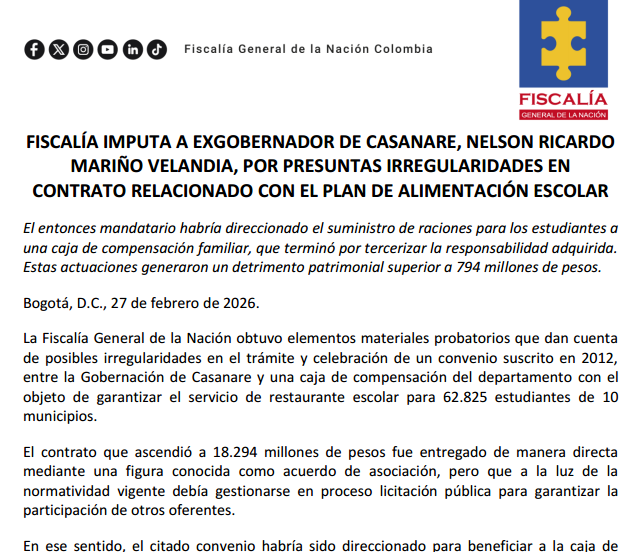 La Fiscalía General de la Nación imputó cargos al exgobernador de Casanare, Nelson Ricardo Mariño Velandia, por los delitos de contrato sin cumplimiento de requisitos legales y peculado por apropiación agravado, tras hallar presuntas irregularidades en un convenio suscrito en 2012 para garantizar el servicio de restaurante escolar.
