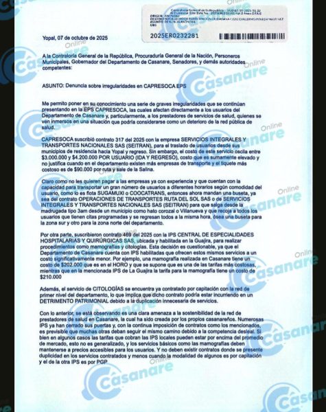 El documento al que tuvimos acceso, y que va dirigido a la Contraloría General, Procuraduría y otras entidades detalló una serie de contratos considerados perjudiciales para el sistema de salud de Casanare.