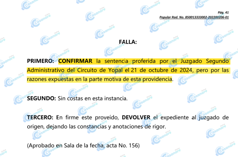 En 2006, el municipio protocolizó la venta por un valor de 33 millones de pesos, un monto muy inferior al comercial. Años después, en 2015, el Tribunal Administrativo de Casanare en una acción popular anterior declaró que el municipio carecía de competencia para enajenar ese bien, que era un baldío urbano, y que existió objeto ilícito en la compraventa. El Tribunal ordenó entonces al municipio promover las acciones judiciales necesarias para revisar la legalidad de esos actos.