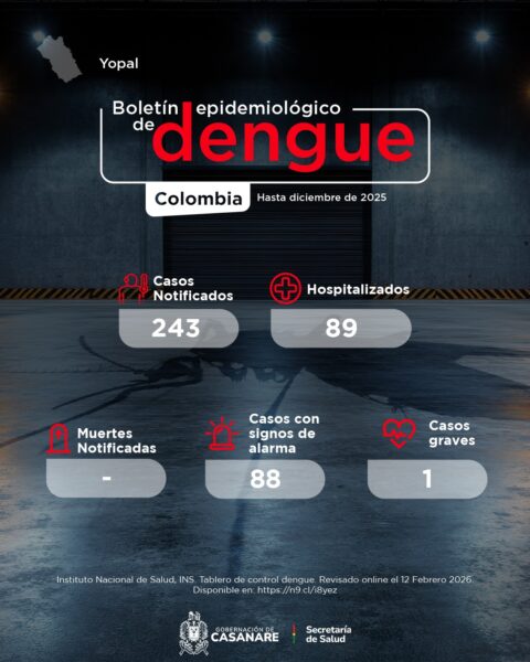 El dengue sigue siendo una amenaza latente en Casanare. Durante 2025, el departamento registró 243 casos, de los cuales 89 requirieron internación, lo que representa un 36,6%. En lo que va de 2026, Yopal ya suma 24 contagios y 11 hospitalizaciones, un 45,8%. A nivel nacional, el año pasado se reportaron más de 120.000 casos y 126 muertes confirmadas.