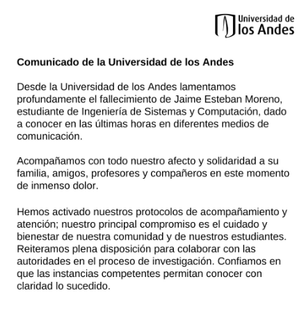 En las plataformas digitales, el caso se ha viralizado. Uno de los docentes de Jaime Esteban en la Universidad de los Andes expresó su profundo pesar y exigencia de verdad: “Haber sido profesor de una persona tan maravillosa como Jaime Esteban Moreno Jaramillo y haber contribuido en su formación siempre fue para mí motivo de inmenso orgullo. Exigimos a las autoridades que se haga justicia. Fiscalía y Policía, urge identificar a los asesinos”. Es un claro llamado a que el peso de la ley caiga sobre quienes arrebataron la vida de un estudiante prometedor.