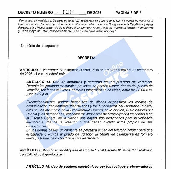 El Ministerio del Interior expidió el Decreto 0211 del 5 de marzo de 2026, mediante el cual se modifican los artículos 14 y 15 del Decreto 0188 del 27 de febrero del mismo año, con el fin de precisar las excepciones a la prohibición del uso de teléfonos celulares y cámaras dentro de los puestos de votación durante las jornadas electorales del 8 de marzo y 31 de mayo.