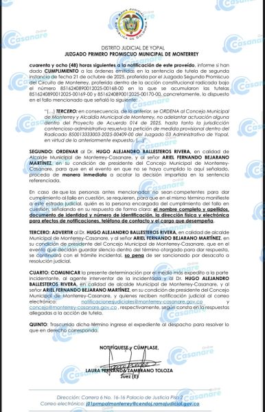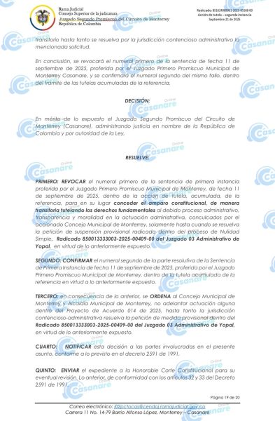 El 21 de octubre, el Juzgado Segundo Promiscuo del Circuito Municipal de Monterrey profirió una sentencia de segunda instancia en una acción de tutela interpuesta por los concejales de oposición. El fallo ordenó a la Alcaldía y al Concejo abstenerse de adelantar cualquier actuación dentro del mencionado proyecto de acuerdo, hasta que se defina una medida cautelar solicitada en un proceso de nulidad radicado en Yopal.