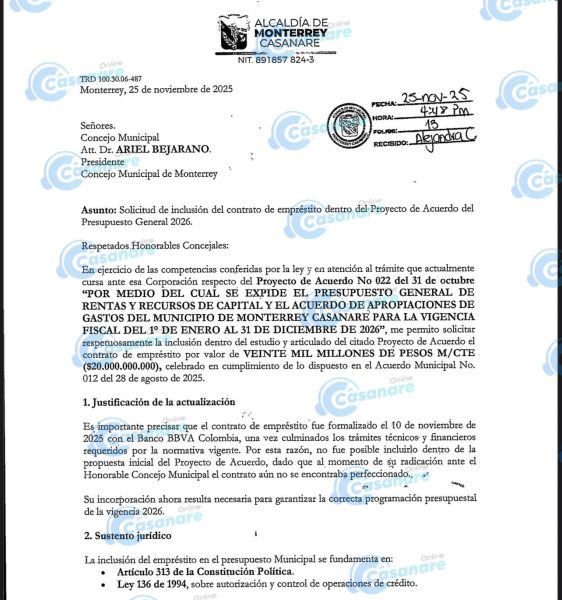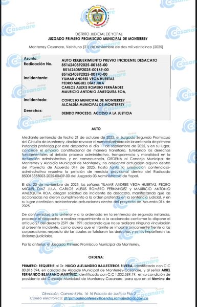 Concejales de oposición del municipio de Monterrey, Casanare, denunciaron un presunto desacato a una orden judicial por parte del alcalde Alejandro Ballesteros y de la mayoría del Concejo Municipal. La situación se origina en el Proyecto de Acuerdo 014 de 2025, que facultaba a la administración municipal para contraer un crédito por 20 mil millones de pesos.